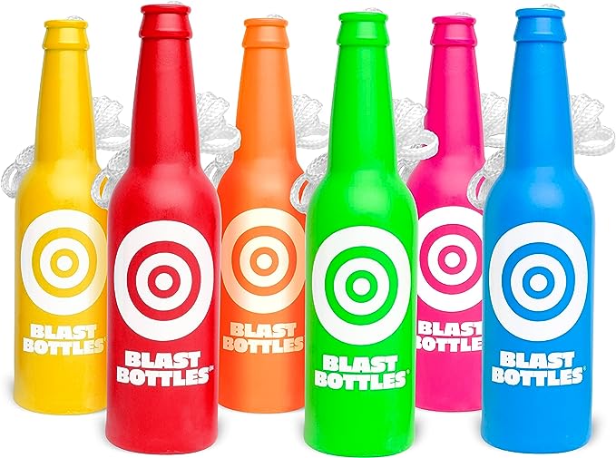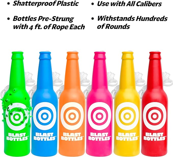 - BLAST BOTTLES: Includes 6 high visibility neon bottle targets made with ultra-durable shatterproof material that is reusable for countless shots – each bottle includes 4 ft. or rope
